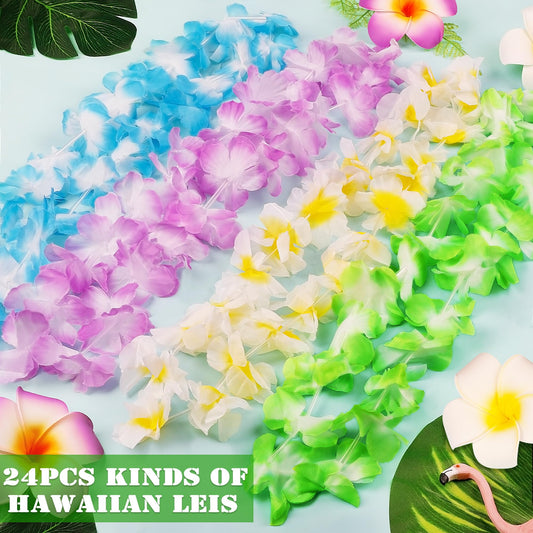 24pcs Leis for Luau Party, Hawaiian Leis Bulk Decorations Silk Flower Necklace, Colorful Tropical Hawaiian Bulk Hula Dance Party Decor, Flower Leis Summer Beach Pool Party Decorations Favors Supplies