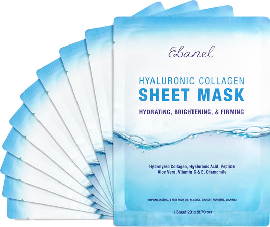 Ebanel 10 Pack Collagen Face Mask with Hyaluronic Acid, Vitamin C, Peptide, Aloe, Instant Brightening Hydrating Face Masks Skincare Korean Sheet Mask, Skin Firming, Lifting Anti Aging Facial Masks