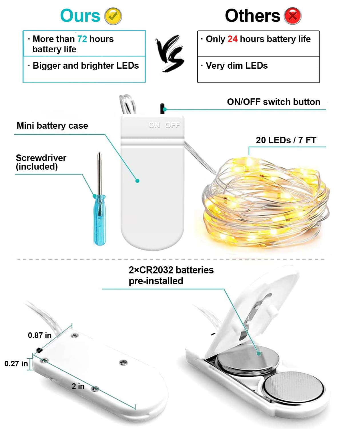 【6 Pack Battery Operated LED Fairy Lights】 Powered by 2 CR2032 batteries (included), the 7-foot-long miniature fairy lights come with 20 upgraded energy-saving LEDs, perfect for daily decoration and holiday decorations. Thin copper wire and small LED bulbs will add a sophisticated and cozy touch to your personal space