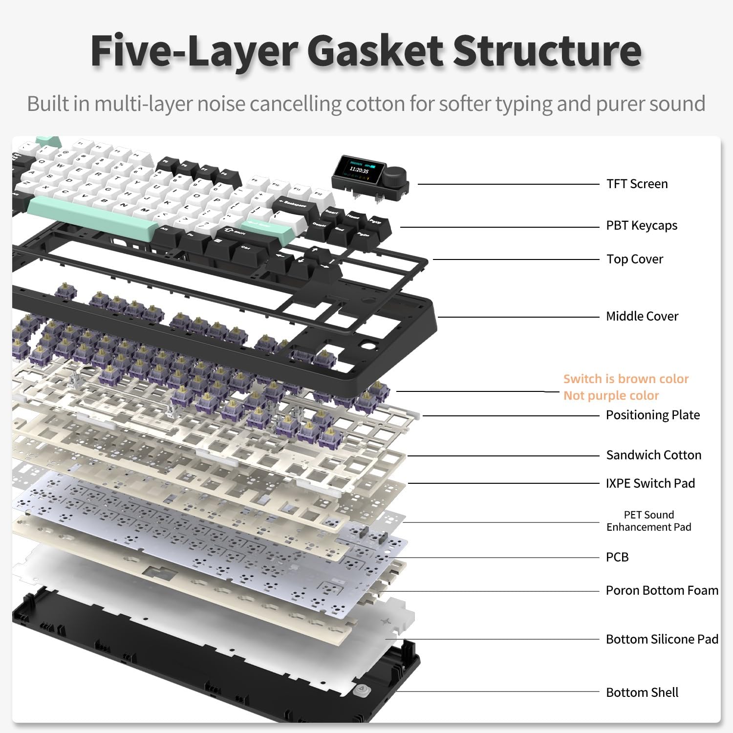【Enhanced Typing Experience】Experience a new level of typing comfort with the AK870's custom gasket keyboard featuring advanced sound-dampening technology. Say goodbye to hollow sounds and hello to a softer typing feel, thanks to the built-in five-layer noise reduction cotton, Poron sandwich cotton, and PCB single key slotting design. Each key press is stable and satisfying, delivering an unparalleled typing experience.
