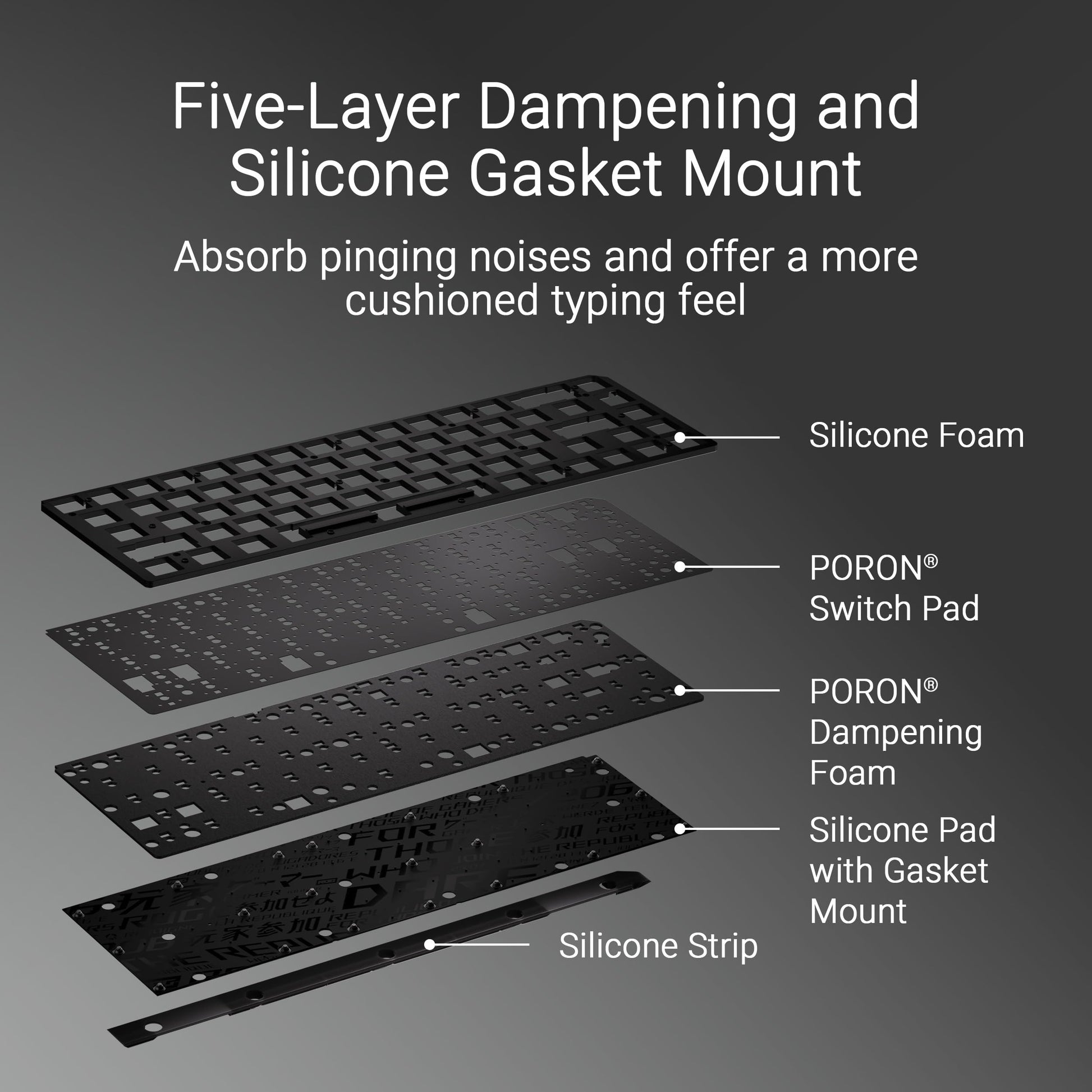 - Enhanced typing experiences: Integrated five-layer dampening and silicone gasket mount absorb pinging noises to create a more cushioned typing experience and a quiet, creamy sound