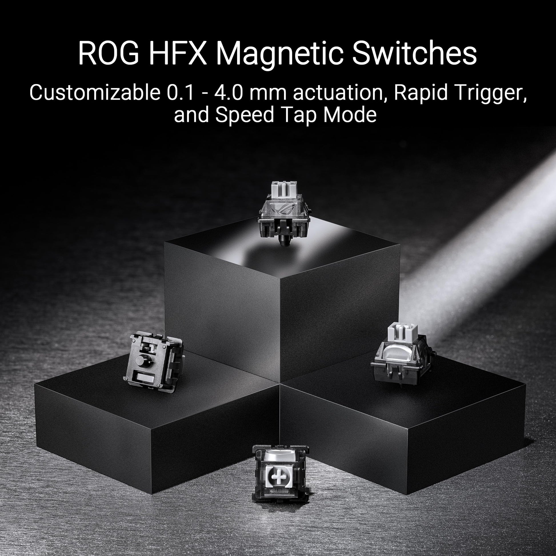 - Pre-lubed ROG HFX Magnetic Switches: These Hall Effect (HE) switches are engineered for a solid feel with ultra fast and precise performance. They also offer an adjustable actuation range from 0.1 to 4.0 mm to cater to all typing preferences