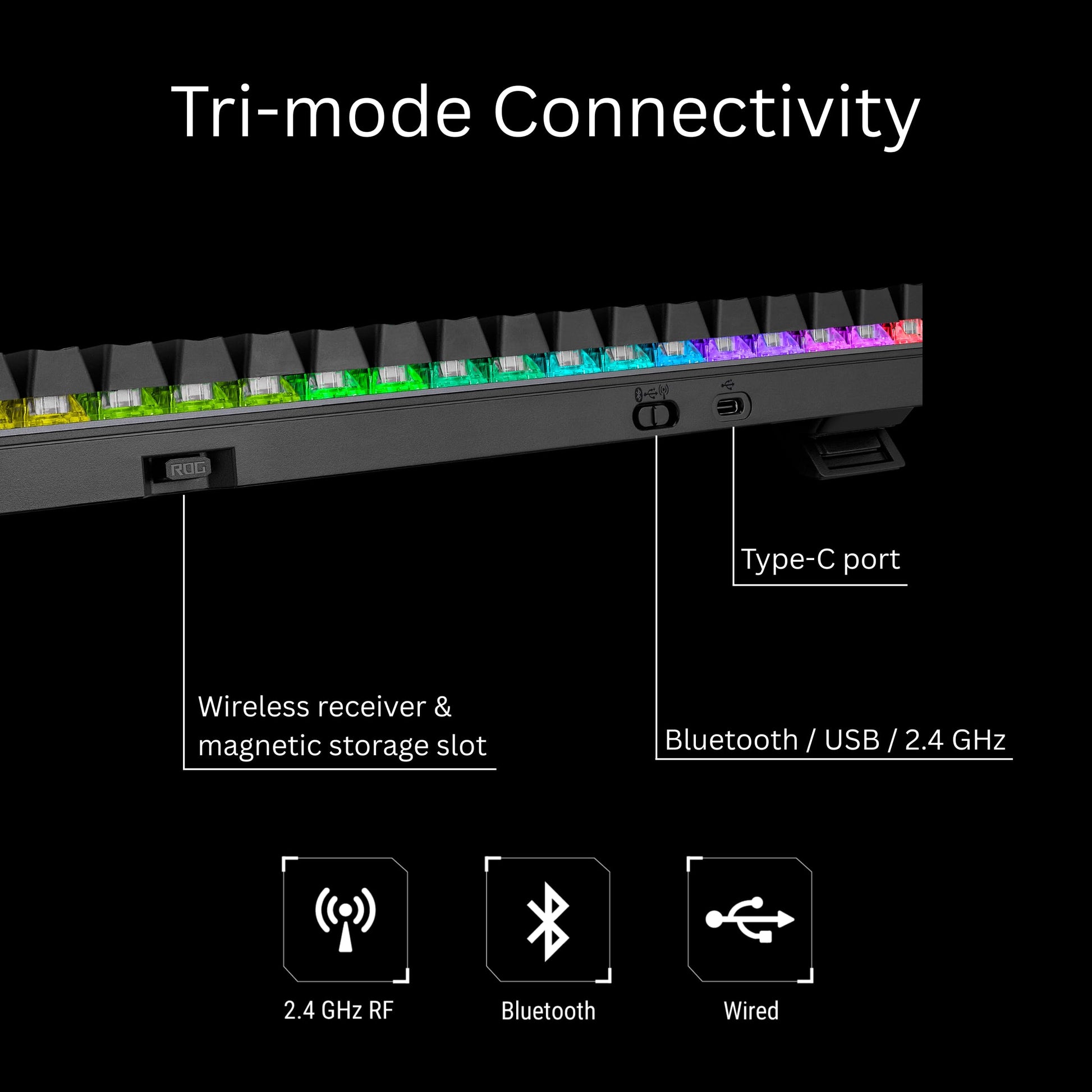 - Versatile Tri-Mode Connectivity: Seamlessly connect via Bluetooth (supporting up to 3 devices), low-latency 2.4GHz wireless with ROG SpeedNova technology, or a reliable USB wired connection. Compatible with both PC and Mac, and boasts an exceptional battery life of up to 1,500 hours in 2.4GHz wireless mode.
