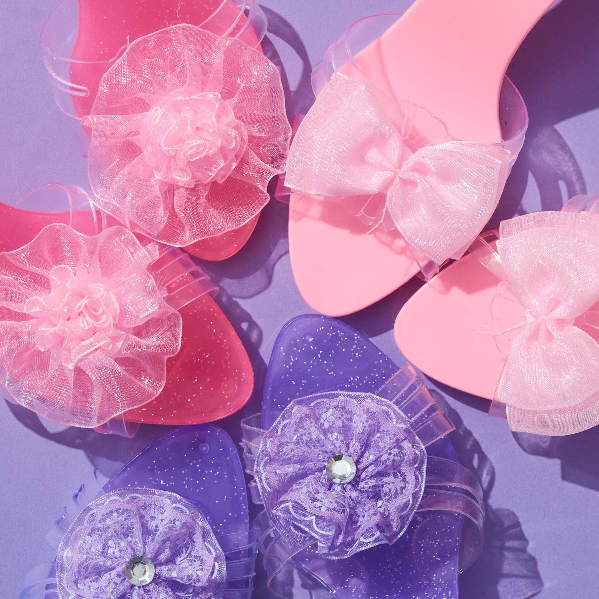ONE SIZE FITS MOST - Designed for your toddler's little feet, each pair of this dress up shoes for girls measures 7.3 inches long, fitting toddler shoe size 7 to 10. Highly suitable for most toddlers and little ladies. 3 PAIRS SET - This princessy shoes set includes 3 pairs of lovely sandals, each with 2-inch royal slip ons in varying styles and colors: (1) A solid pink with ribbon bow accent, (2) A glitter-infused purple sandals with lilac flower and gem accent, and (3) A glitter-infused pink pair with rose accent - all in one adorable set.