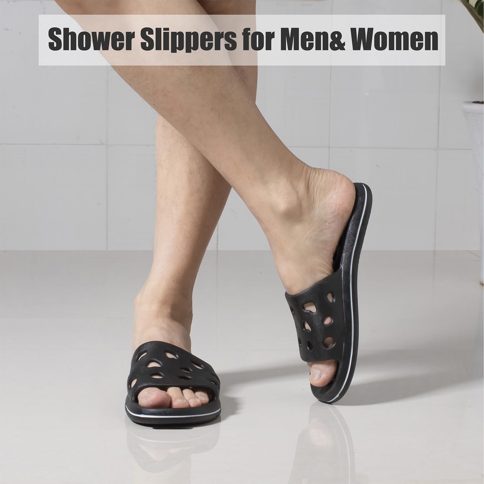 FINLEOO Shower Shoes for Women Men, Quick Drying Shower Sandals with Drain Holes Non-Slip Pool Slides Comfortable Lightweight House Slippers-Black