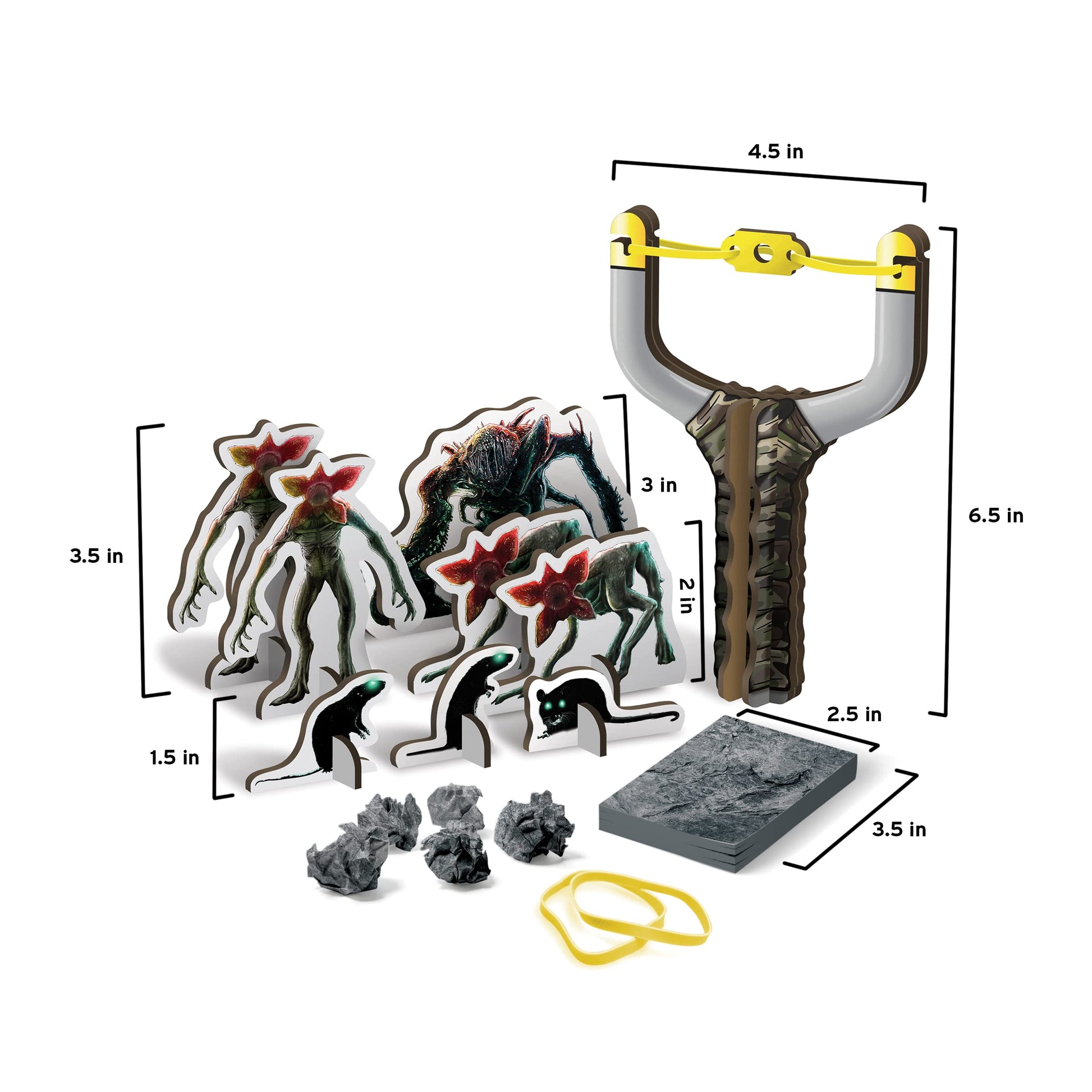 Details: Help your friends defeat the creatures of the Upside Down with Lucas’s signature slingshot. Each pack includes a 30-sheet pad of “rock” paper, 2 rubber bands, 8 malevolent entities, and 1 trusty slingshot with all of Lucas’s signature detailing. It’s your mission to save the day! Made of durable MDF and packed in a colorful window box, each comes flat-packed with simple instructions for quick and easy assembly. Designed by Genuine Fred and officially licensed by Netflix.