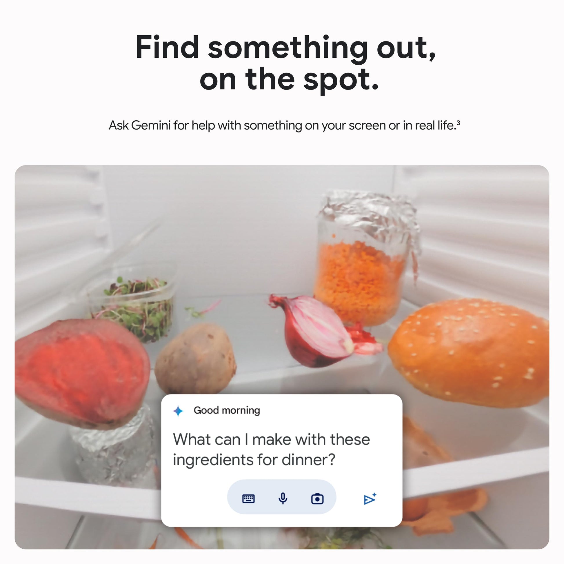 Get more info quickly with Gemini, your built-in AI assistant[3]; instead of typing, use Gemini Live; it follows along even if you change the topic or switch the question[30]; and Pixel Screenshots helps you save things you’ll want to remember later