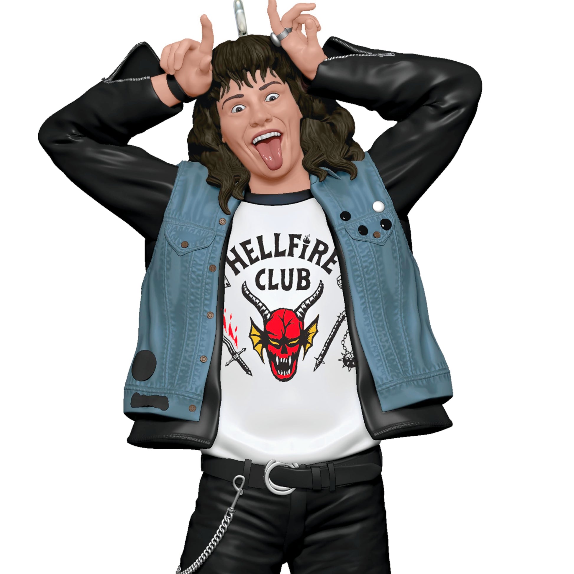 Details: We think it's finally your year! Turn your frown upside-down and celebrate the holidays with Eddie Munson, resident metalhead, 6th-year senior and leader of the Hawkins High School D&D club. This "Stranger Things" Christmas tree ornament features hoodlum-turned-hero Eddie making a face with horns and sporting a Hellfire Club T-shirt under his leather bomber jacket and denim vest. With unparalleled artistry and exceptional detail, Hallmark Keepsake Christmas ornaments are perfect for preserving precious memories, commemorating special milestones and celebrating individual hobbies and interests.