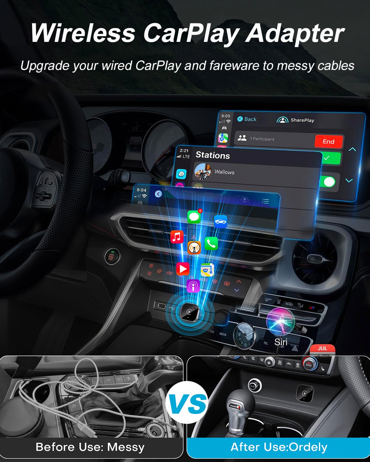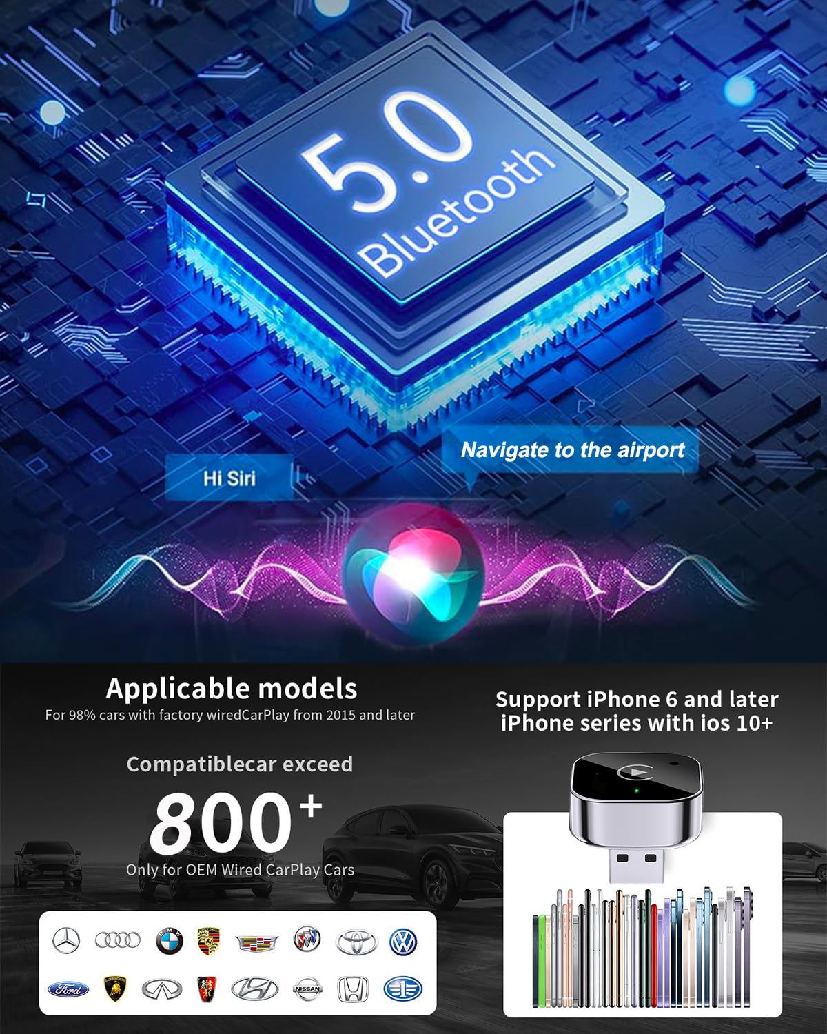 [Enhanced Performance ] This wireless CarPlay adapter with an upgraded smart chip is designed to convert your existing wired CarPlay system into a seamless wireless setup, ensuring full compatibility with navigation, music, Siri and calls. Transform your driving experience with a wireless CarPlay adapter. (Note: Ensure your car supports wired CarPlay before purchase.)