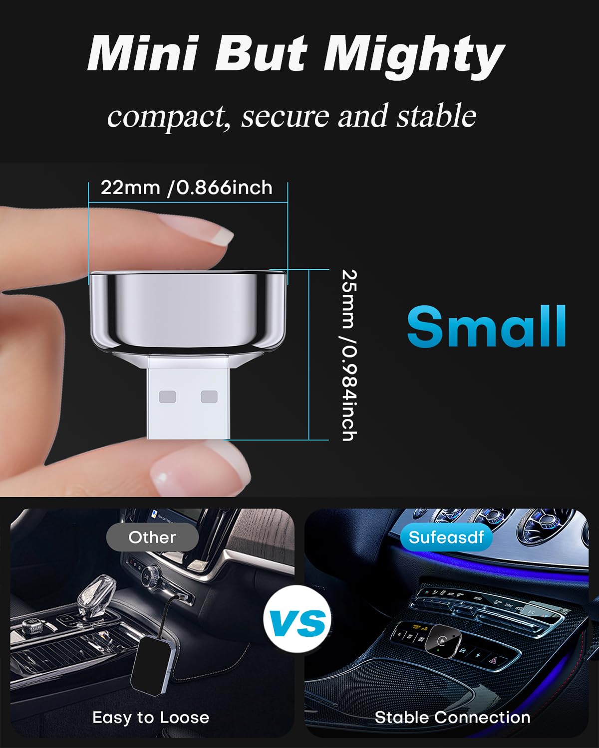 【Ultra-Compact Design】Say goodbye to tangled cables and bulky setups! Our wireless CarPlay adapter is engineered with a thumb-sized design that fits seamlessly into your car’s USB port, leaving no trace of clutter. Perfect for minimalist interiors, it effortlessly tucks away while maintaining a sleek, professional look.