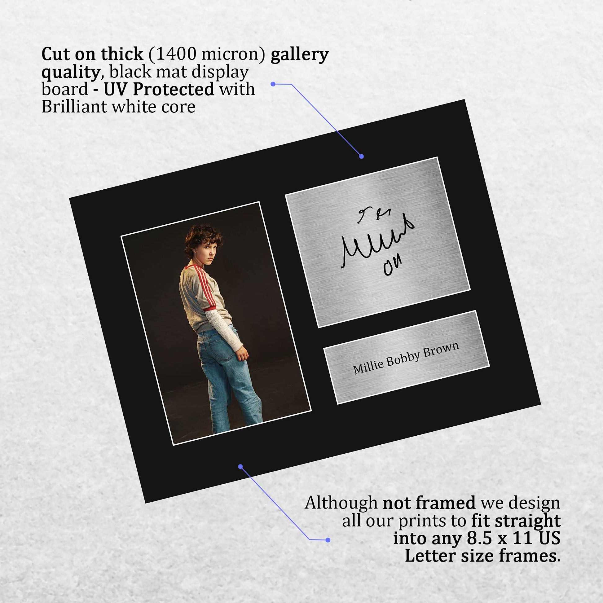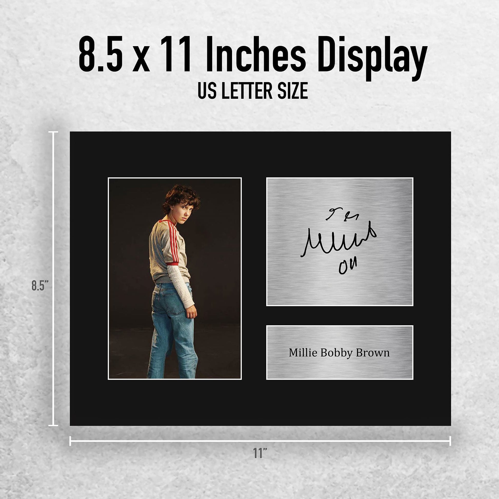 Details: Professionally made in our studio, this US Letter Size (8.5x11 Inch) unframed Millie Bobby Brown display makes for an ideal gift idea. This laser printed quality photograph is mounted in a precision cut three windowed acid-free matt black display board. To the left of the display there is the main image. To the right of the display there are two metallic effect plaque areas for printed copies of the name and autograph signature. These mounts also come with a ridgid backing board making them very sturdy and can be displayed or hung as they are. If you wish to frame them they will fit in any US Letter Size Frame. Alternatively we offer a framed version too. Lightweight, but of the highest quality, these make the ideal Christmas/Birthday gift for fans of all ages, and best of all, they definitely won't break the bank!