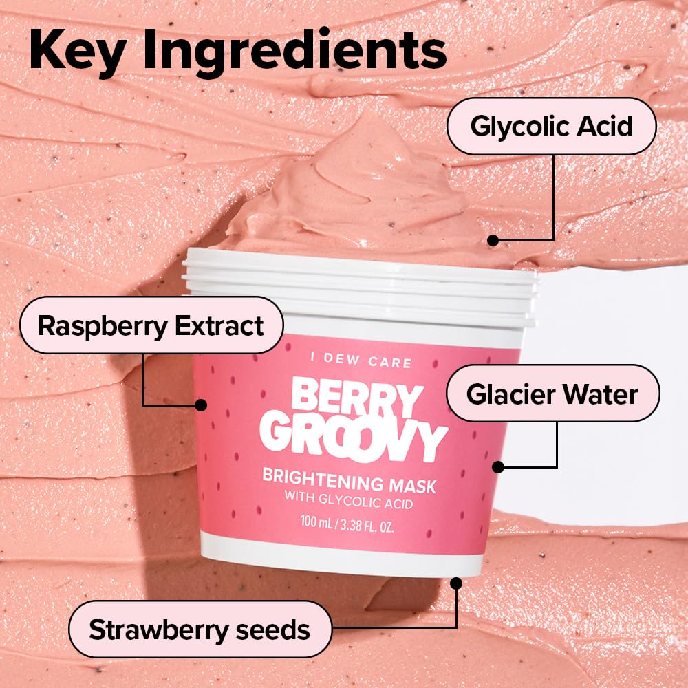 BERRY GROOVY EXFOLIATING MASK: A berry clay mask packed with Glycolic Acid, Raspberry extract, and exfoliating seeds to help remove dead skin cells and unclog pores — your go-to pore cleansing face mask for smooth, glowing skin.