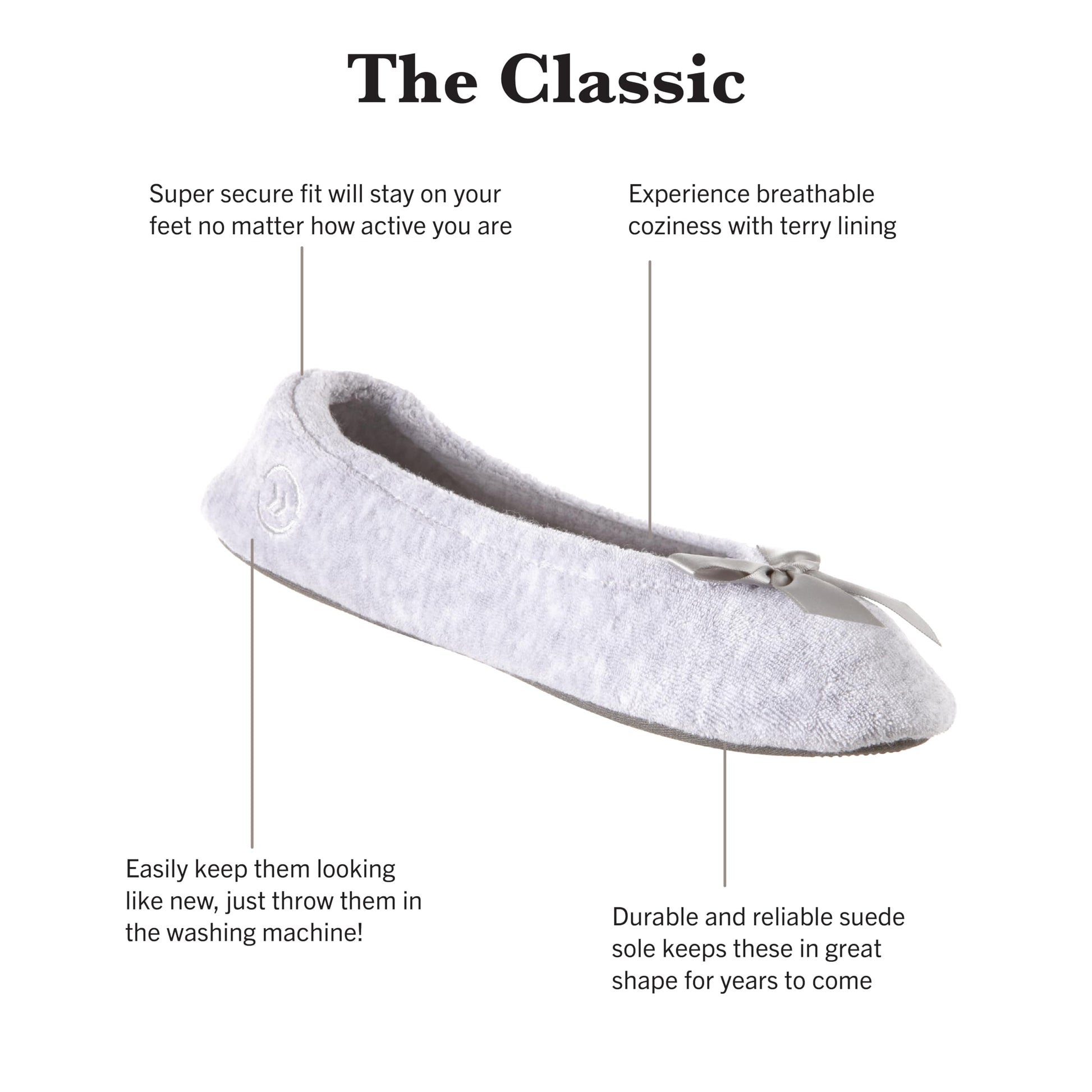 LASTING COMFORT: Designed for comfort that lasts, these slippers feature a cozy terry cloth lining and genuine suede sole. The classic ballerina shape is easy to slip on and off, perfect for everyday lounging at home.