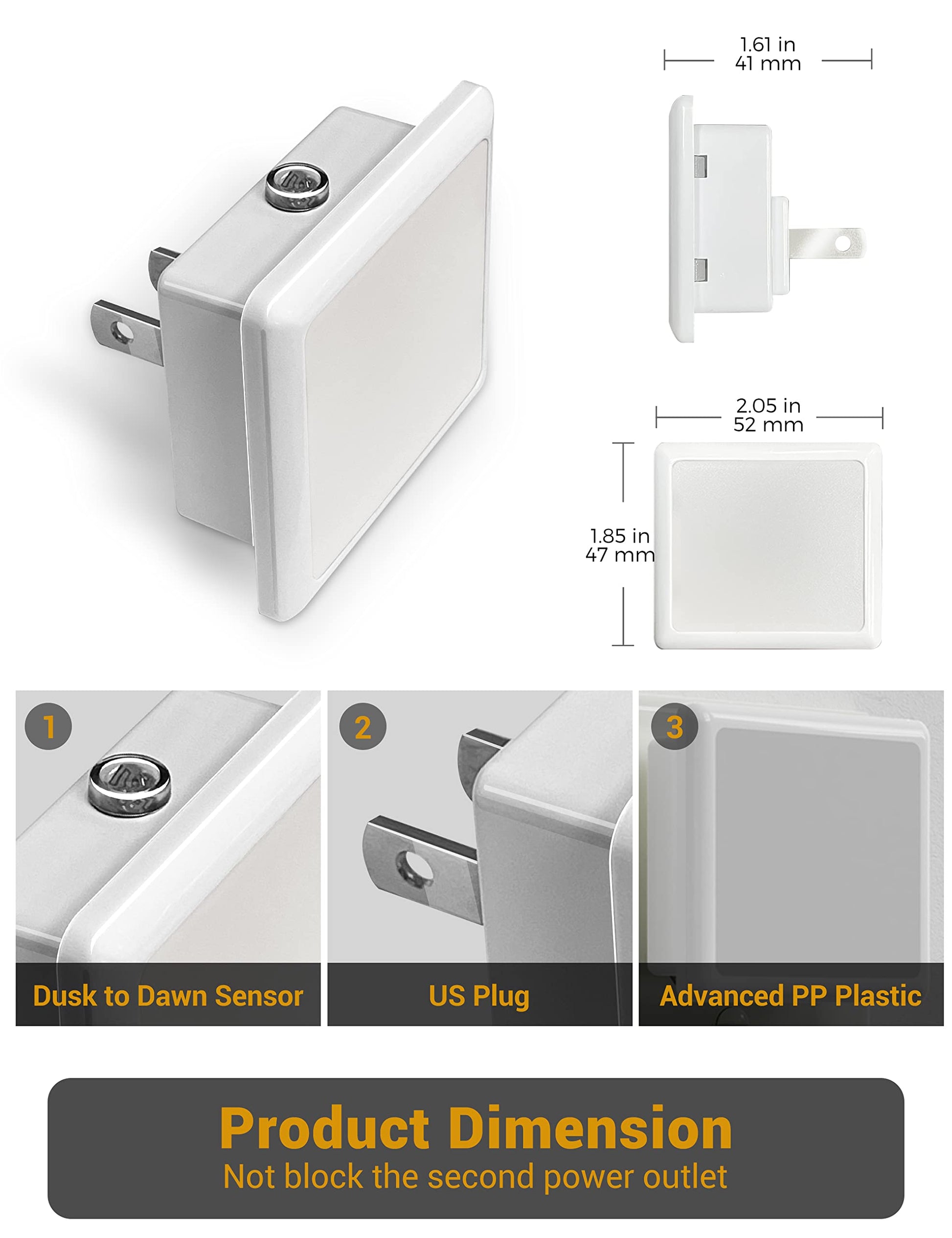 Auto On/Off: The LED night light comes with a sensitive light sensor, it will automatically light on when surrounding is dim enough and light off when surrounding is bright enough. No more manual switching on and off.