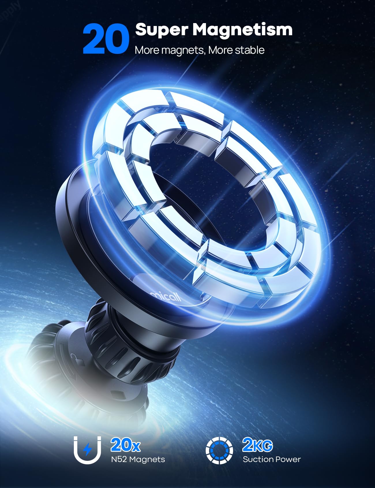 20 Upgraded Magnets: 2025 Upgraded Magnet Layout - 38.7% Power Boost! Lamicall car mount for Magsafe built-in 20 upgraded N52 super magnets, which can easily hold items up to 4.4 lbs. Super powerful magnets ensure a firm hold on your cell phones. Never afraid of falling off even braking strongly, taking sharp turns or driving on rough roads. A practical for MagSafe accessory, car accessory.