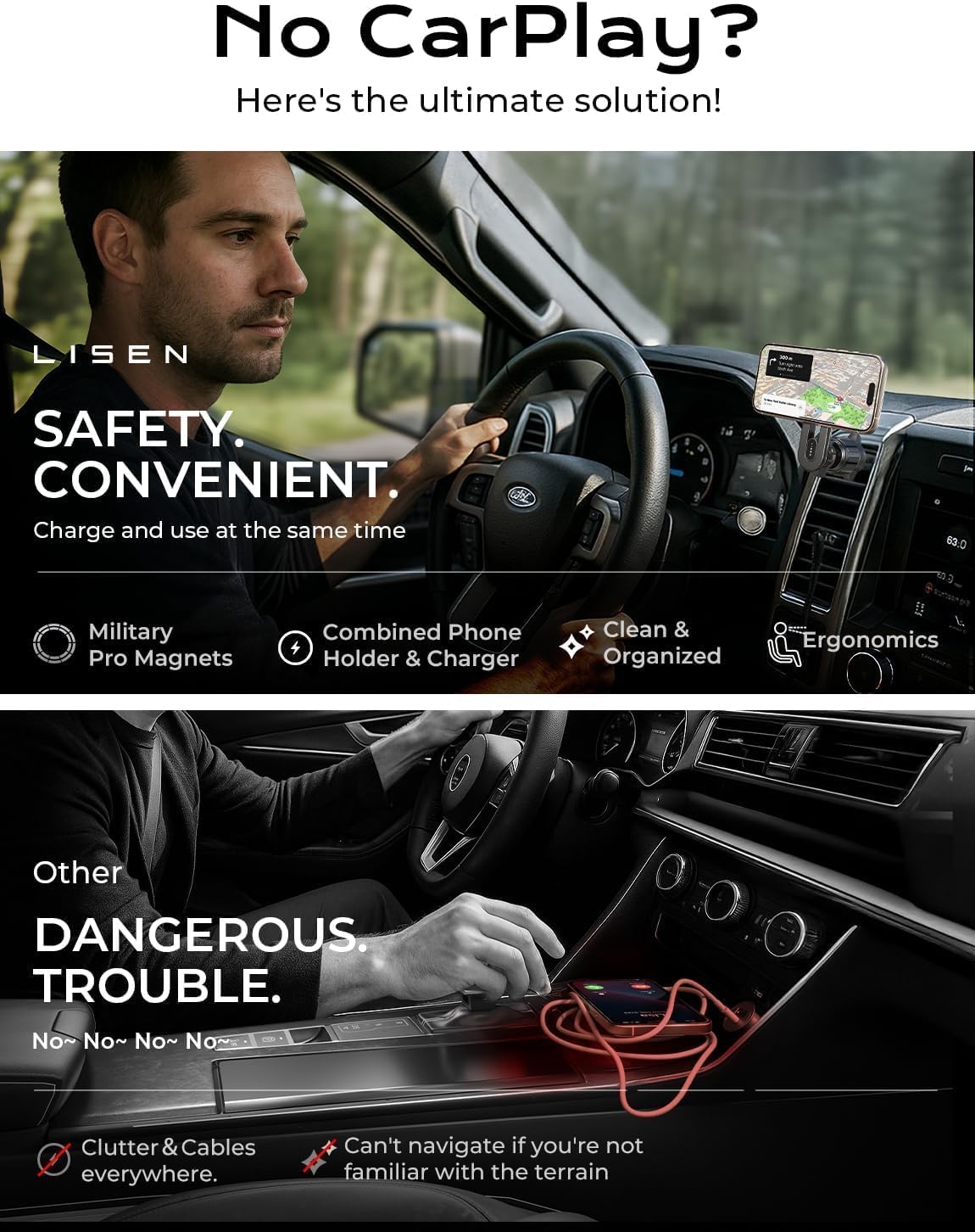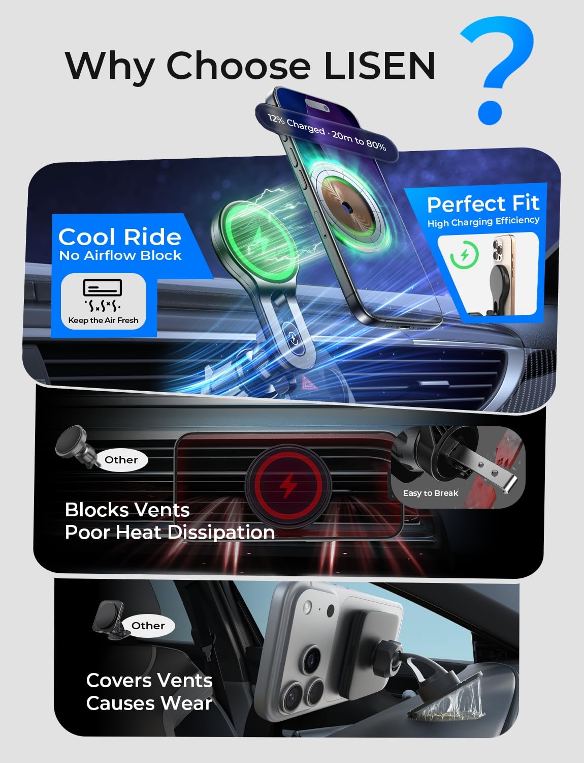- [One-Click Release]: Enjoy the convenience of one-click operation for easy phone placement and removal. No need to fret over complex installation steps, keeping you focused on your driving, LISEN magsafe car mount fast charging Suitable for iPhone 17 16 15 14 13 12 series and other phones supporting Wireless charging. We provide a one-stop solution to satisfy all your charging needs