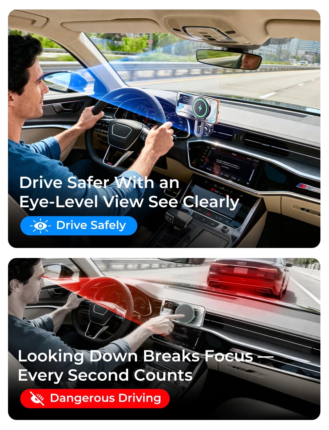 - [Pioneering Car-Mounted Marquee]:This MagSafe wireless car charger mount delivers not only superior performance but also a visually captivating ambient light experience. With its pioneering design and elegant glow, it redefines in-car ambiance — lighting up your driving journey with the perfect blend of technology and aesthetics.
