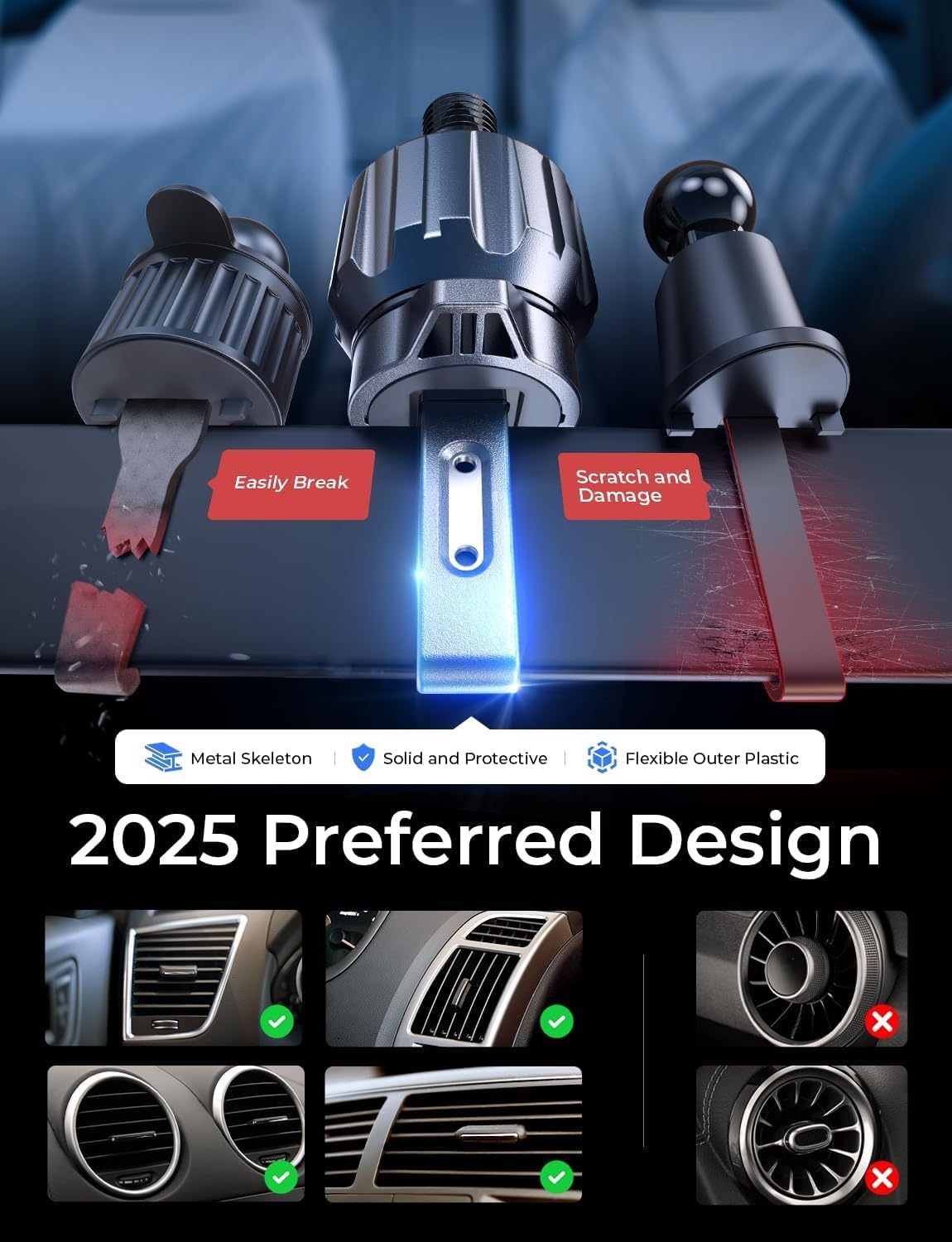 - [Compatible with Horizontal & Vertical Vents]: The Steel hook clip of this cell phone mount for car is 50% longer than the ordinary one. It’s compatible with most Horizontal & Vertical vents, which solves the common problems of poor compatibility and cradle easy falling off on the market. 𝙉𝙤𝙩𝙚: 𝙍𝙤𝙪𝙣𝙙 𝙫𝙚𝙣𝙩𝙨 𝙢𝙖𝙮 𝙣𝙤𝙩 𝙛𝙞𝙩, 𝙖𝙣𝙙 𝙪𝙣𝙘𝙤𝙣𝙫𝙚𝙣𝙩𝙞𝙤𝙣𝙖𝙡𝙡𝙮 𝙨𝙝𝙖𝙥𝙚𝙙 𝙫𝙚𝙣𝙩𝙨 𝙢𝙖𝙮 𝙖𝙡𝙨𝙤 𝙗𝙚 𝙞𝙣𝙘𝙤𝙢𝙥𝙖𝙩𝙞𝙗𝙡𝙚