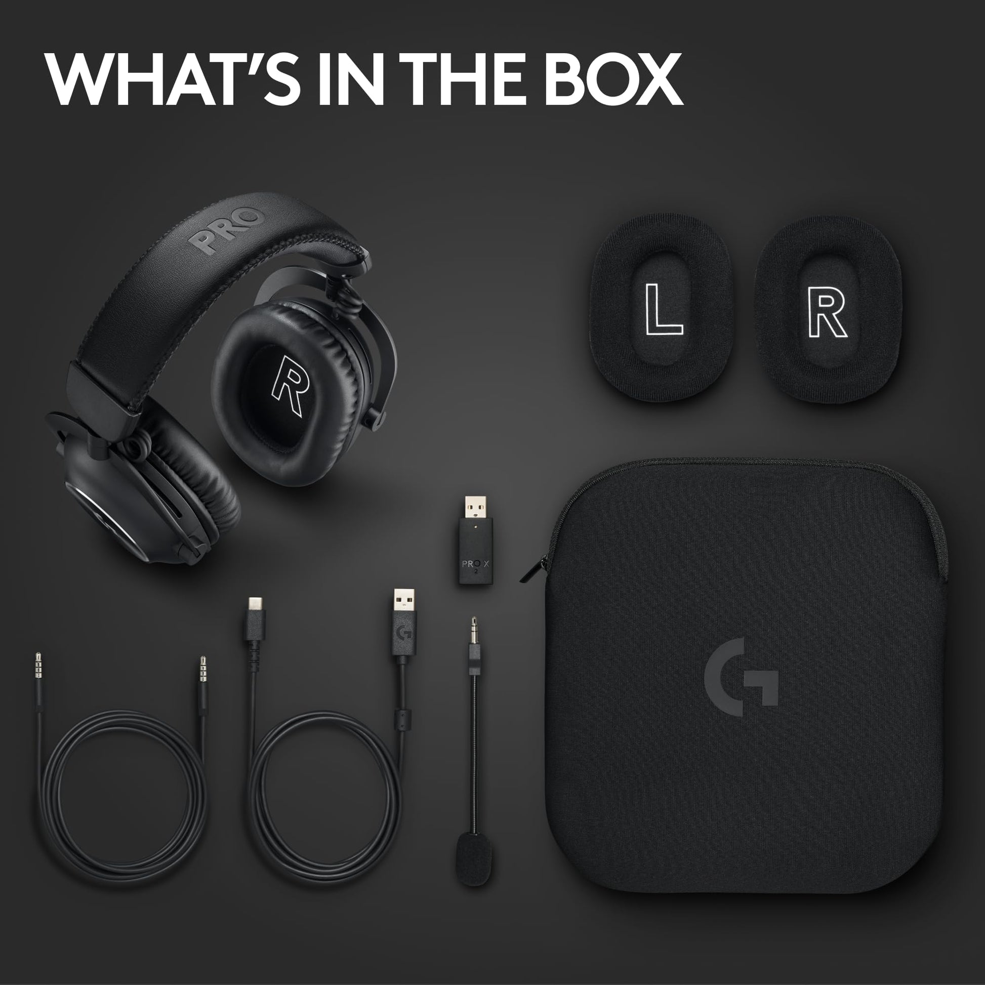 Details: PRO X 2 LIGHTSPEED Wireless Gaming Headset was designed in collaboration with the world’s best players—made available for all. Take your game to the next level with proven pro-grade tech, lighter weight, and improved comfort. Award-Winning PRO Design: Designed with the world’s best pro players to remove any barriers between you and the win. 50mm Graphene Drivers: A pure graphene diaphragm produces greater sensitivity, enhanced frequency response, lower distortion and smaller, louder speakers, allowing you to hear the entire soundscape of the game. Logitech LIGHTSPEED Wireless Technology: Play with the freedom of this wireless gaming headsets with mic for up to 50 hours of use on a single charge and a connection range up to 30m (2). Comfortable Design: Lighter weight and supreme comfort, with a rotating durable hinge and rotating swappable headphone earpads in leatherette and velour. Multiple Connection Options: LIGHTSPEED wireless, Bluetooth gaming headphones, and 3.5mm audio cable wired connection options allow players to prepare for any situation. Clear Communication: Eliminate pops and hisses with gaming headphones with mic wireless to communicate with clarity and confidence with the 6mm cardioid microphone on a detachable boom mic arm that has advanced Blue VO!CE technology (1). DTS Headphone:X 2.0 Surround Sound Speakers: Hear your opponents before they find you with precision surround sound and a deeply immersive soundscape (1). Durable Construction: PRO Gaming Headset is designed with an aluminum and steel frame for a balance of comfort and strength for pc gaming headset wireless needs. (1) Requires Windows PC and Logitech G HUB software. (2) May vary based on user and computing conditions.