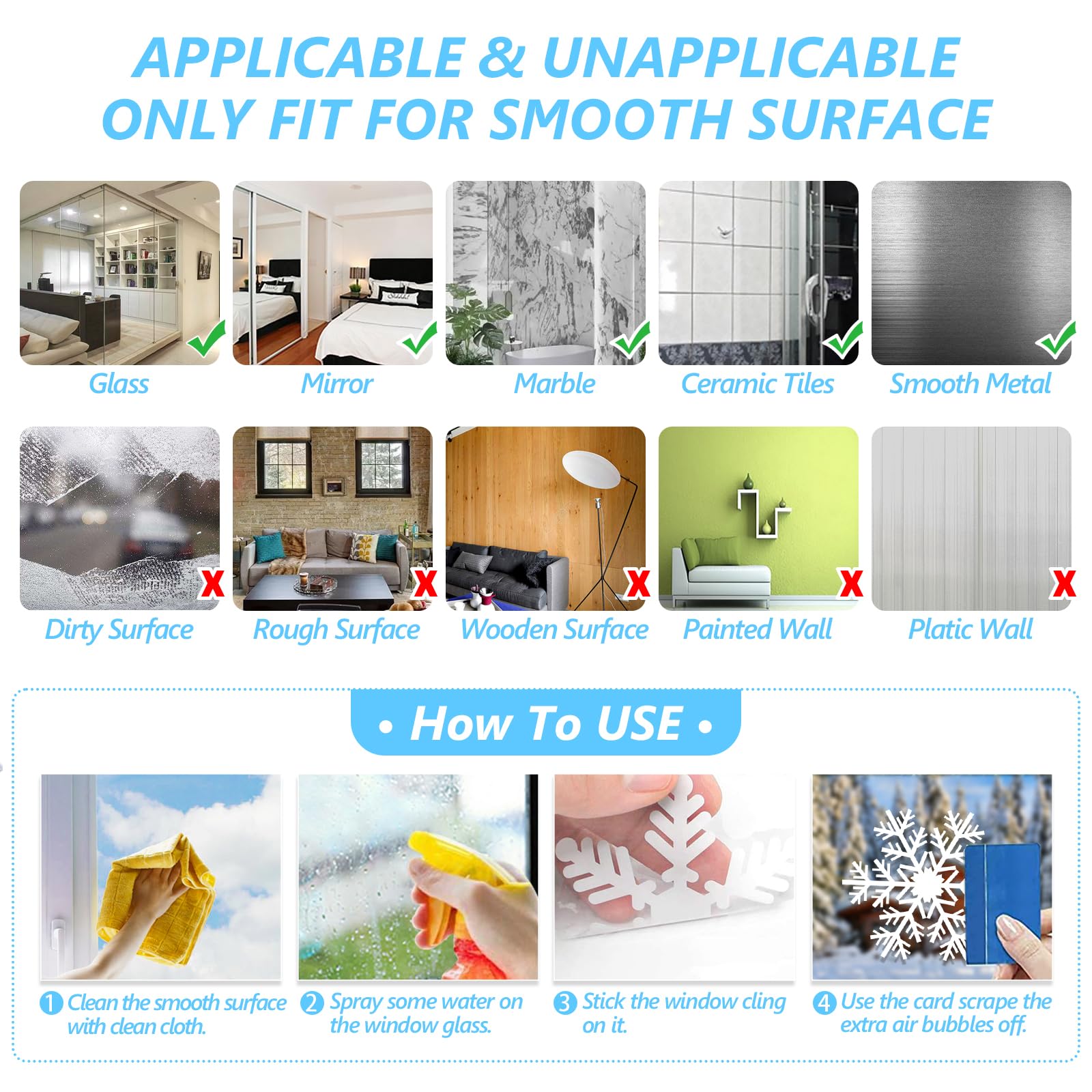 PERFECT FOR ANY SMOOTH SURFACE: Christmas snowflakes window clings, fit for any smooth surface: sliding glass door, glass window, shop window, ceramic tiles, home appliance, etc. Great as Christmas stickers, Xmas decals, Static snowflakes stickers, snowflakes decals decorations, make amazing Christmas party supplies, Xmas decorations indoor ornaments, holiday home décor.
