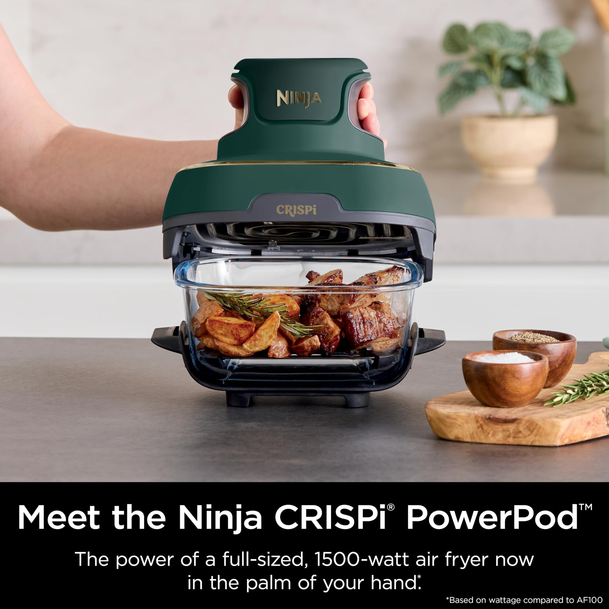 - CRISPI POWERPOD: The power of a full-sized air fryer now in the palm of your hand* *Based on wattage compared to Ninja AF100