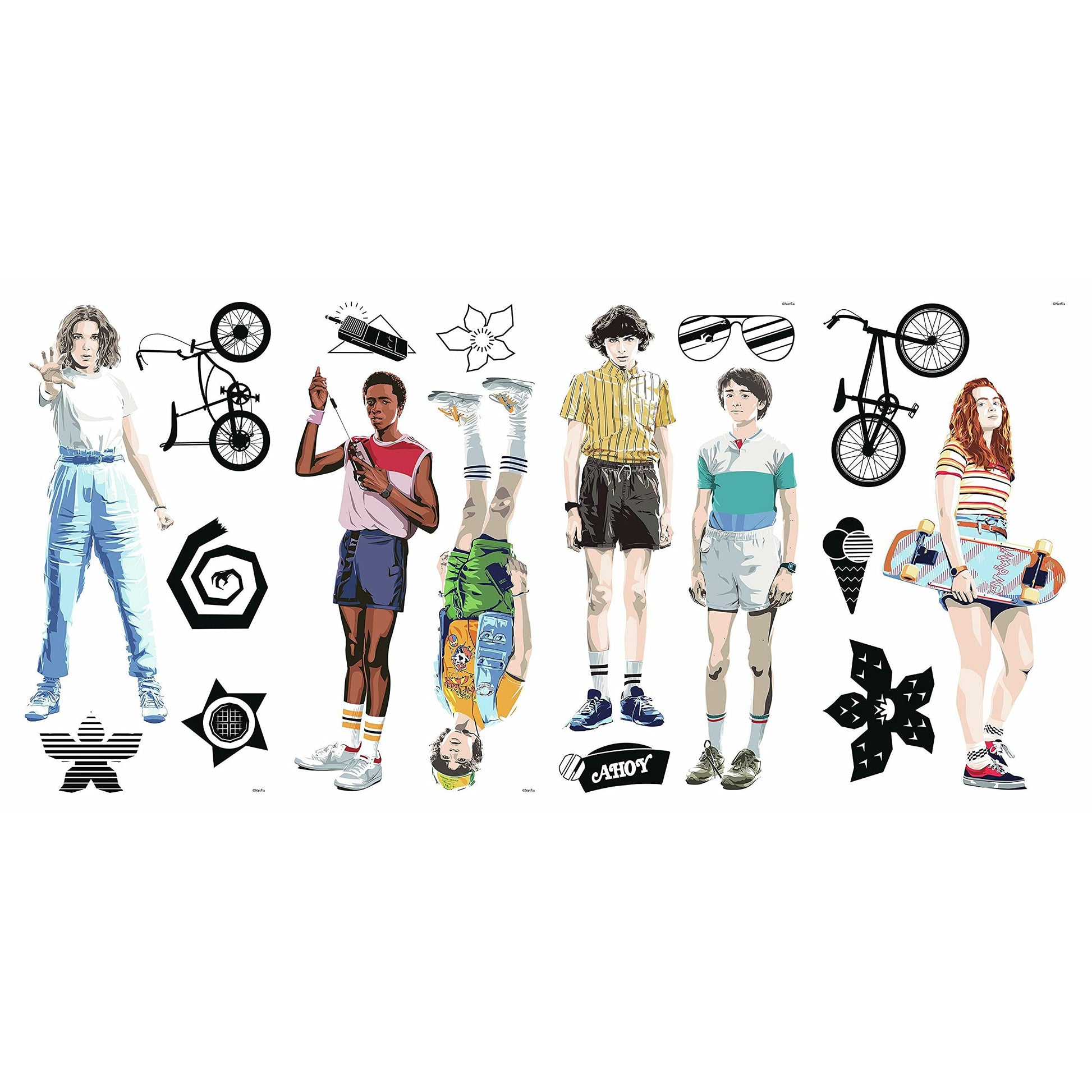 Details: Netflix’s fans of fictional town, Hawkins IN, will love to surround themselves with the main cast of the hit show “Stranger Things” thanks to these fun peel and stick wall decals from RoomMates. This officially licensed decal set features Eleven, Dustin, Lucas, Max, Mike, and Will along with a variety of iconic decal accents. Decorate walls, lockers, furniture or any flat surface. RoomMates wall decals are an easy and affordable way to decorate in minutes. Reposition or remove them effortlessly with no remaining sticky residue or damage to walls.