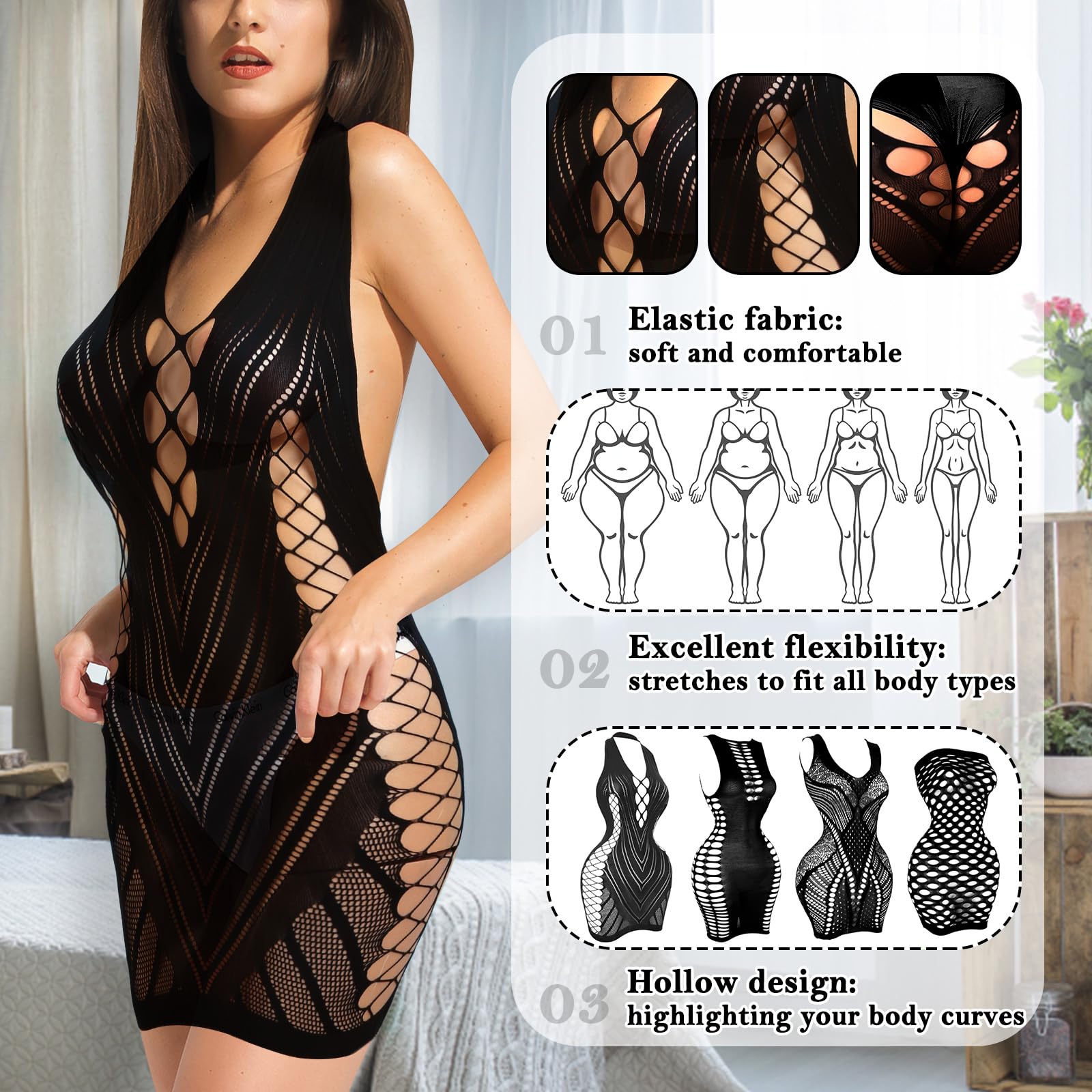 HOLLOW DESIGN: The crotchless lingerie for women is in a lace-up halter and mesh design, which will highlight your body curves, you can wear it as a lingerie fishnet dress, a sleeping dress, or as a club dress which will look great with jeans, shorts, skirts and heels for a night out, you can also wear as a bikini cover-up, it will bring you more outfit inspiration