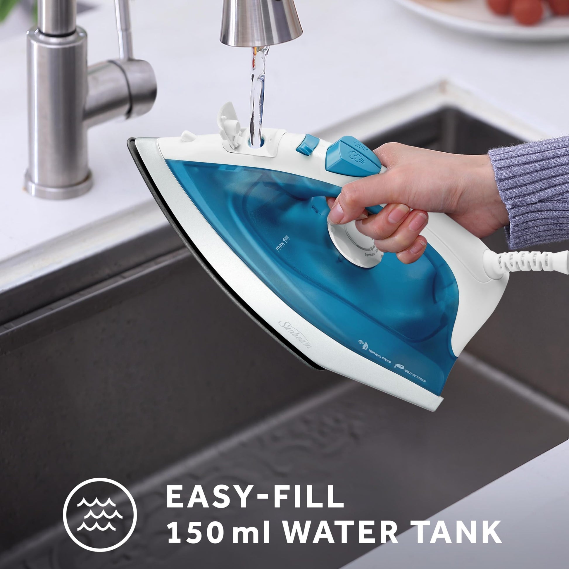 Sunbeam Compact Steam Iron, 1200 Watts, Non-Stick Soleplate, Powerful Shot of Steam, Horizontal or Vertical, Spray Mist, Precision Tip, White/Blue