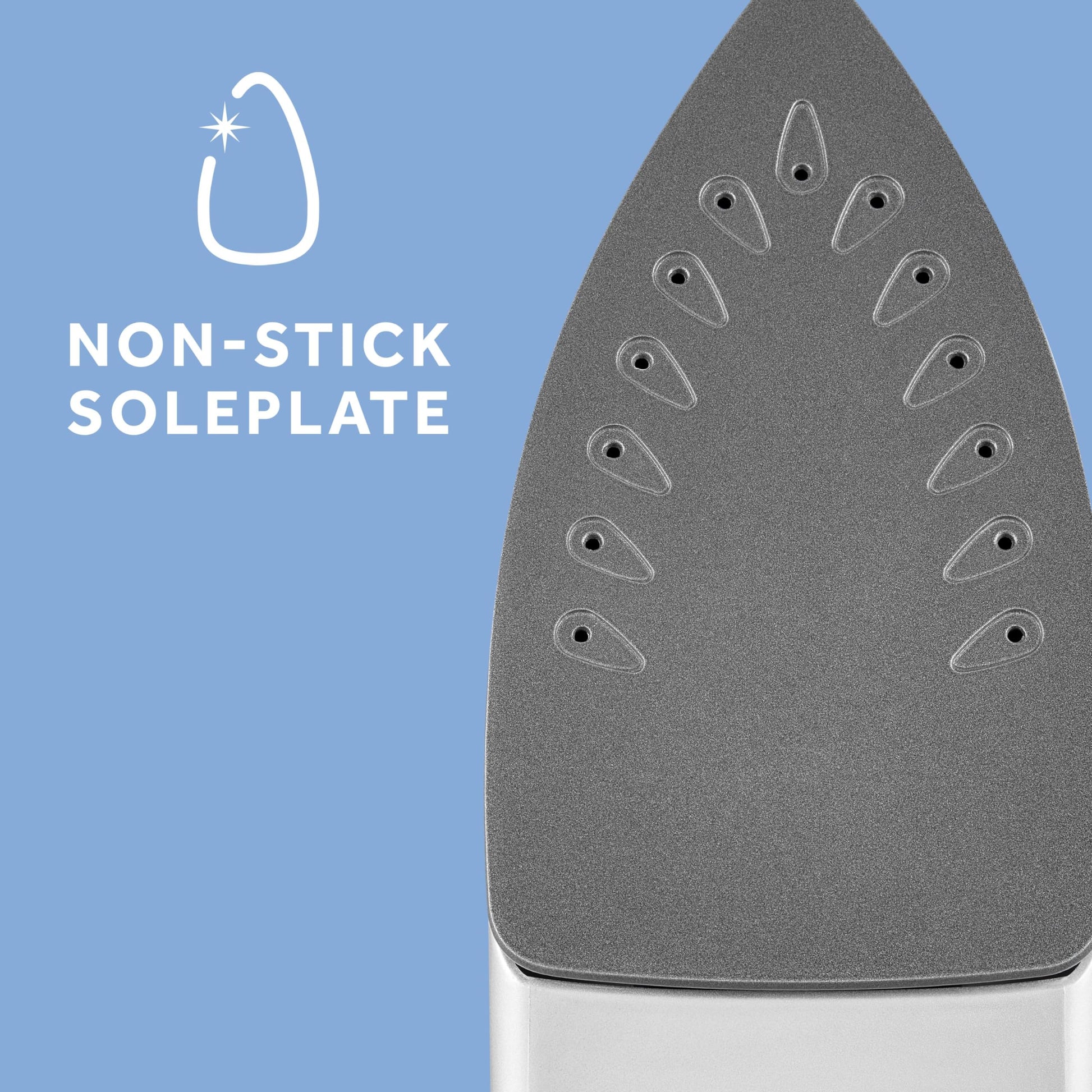 Details: Sunbeam Compact 1200W Steam Iron for clothes is efficient and easy to use. Includes a powerful SHOT OF STEAM® feature to provide an extra burst of steam to help smooth out stubborn wrinkles on both flat surfaces and vertically for hanging garments, upholstery, or drapery. The precision tip allows you to get in between buttons, lapels and around collars and the 8-foot 360° swivel cord provides freedom of movement during ironing. The durable non-stick soleplate surface glides easily over fabrics to smooth out wrinkles quickly and efficiently and have you looking your best.