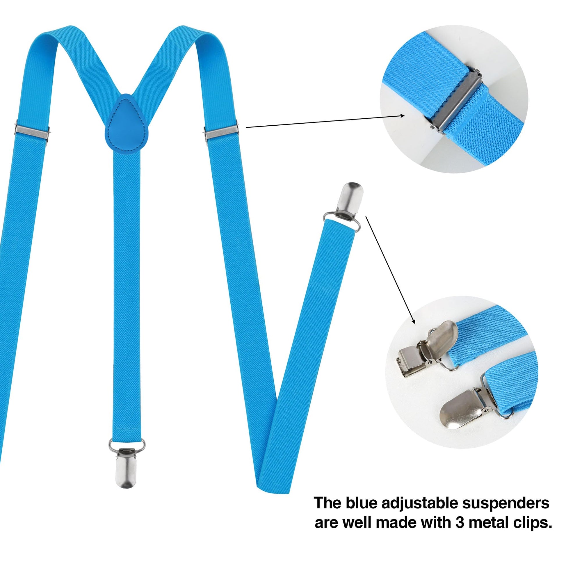 Adjustable Fit: The blue suspenders feature adjustable clasps to accommodate various body sizes and ensure a comfortable, secure fit
