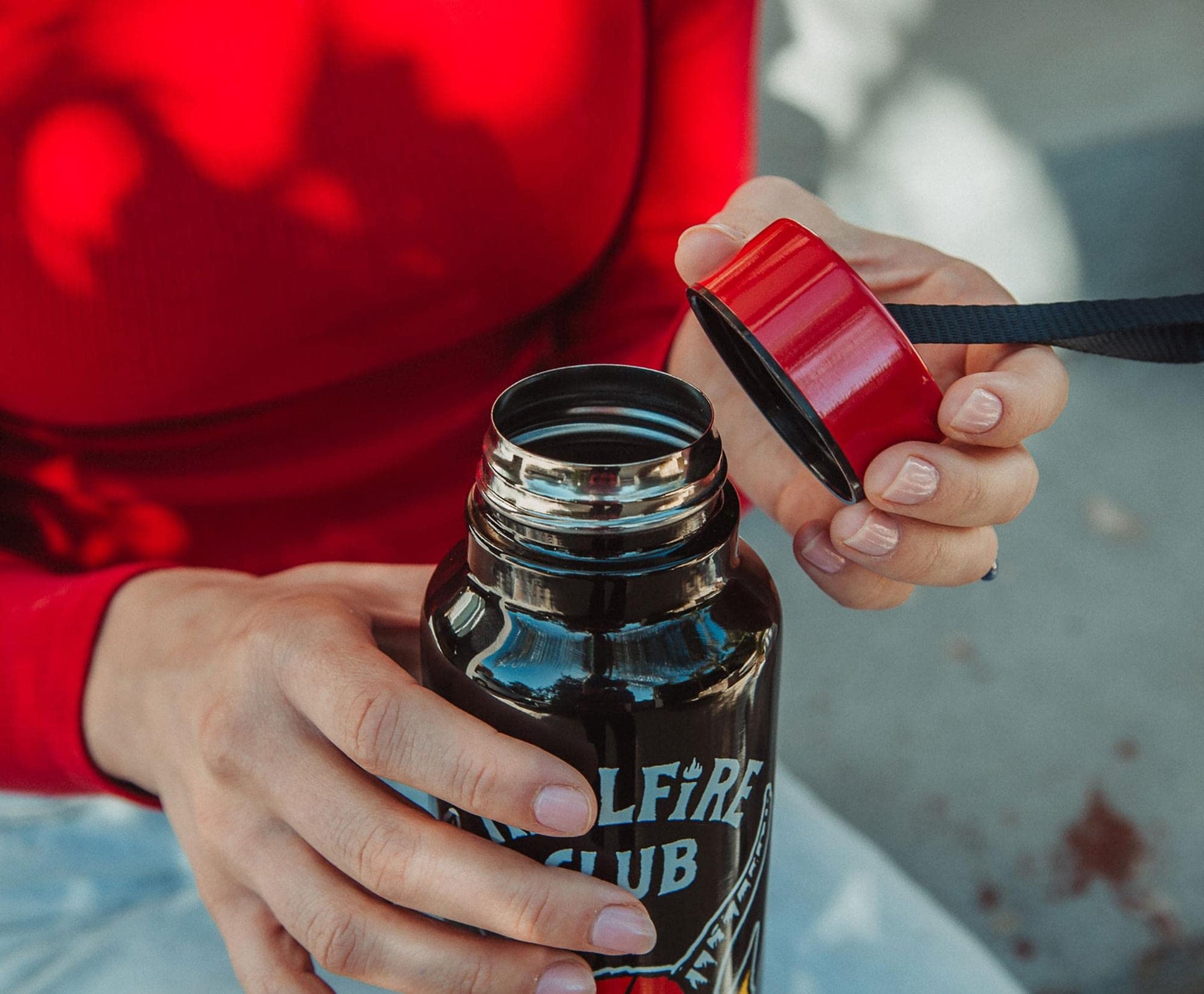 Details: WELCOME TO HELLFIRE Ready to make '86 your year? Increase your hit point maximum with this exclusive Hellfire Club Stainless Steel Water Bottle from Stranger Things. Every misfit and outcast has a place in Hellfire Club under the wing of Eddie the Banished. "Freaks" who like to play a fantasy game gotta stick together, after all. You'll be the hero of your next D&D adventure with this metal water bottle that comes branded with the logo of Hawkins High's most controversial club. THERE'S NO SHAME IN RUNNING Taken a lot of damage after facing off with Vecna? Regain HP with every sip from this BPA-free stainless steel water jug that comes with a leak-resistant lid and attached handle for good measure. The double-walled insulation helps prevent excess condensation from forming when your palms are sweaty from rolling the dice. Hold your devil horns up proudly with officially licensed drinkware inspired by Stranger Things. CARE INSTRUCTIONS Easy care Top-rack dishwasher safe Not microwave safe