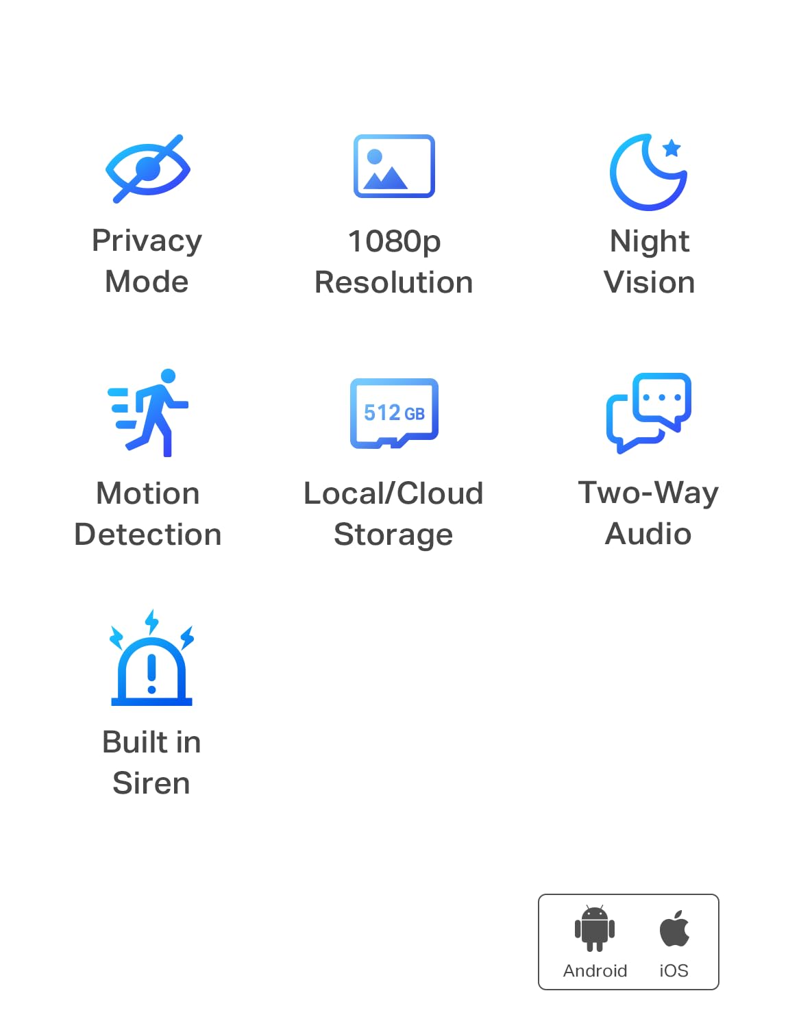 Details: Protect your home with the Tapo C100 smart indoor security camera Wi-Fi. Featuring crystal-clear 1080P high-definition video, it captures every detail inside your home. Receive instant push notifications when motion, a person, or baby crying is detected from this baby camera monitor, all without additional fees. Monitor your home day and night with up to 30ft of night vision using the integrated IR sensor. Utilize the 2-way audio with a built-in siren to use as a pet camera with the phone app and deter intruders. Fully compatible with Amazon Alexa and Google Assistant, simply use voice commands to view the Tapo indoor security camera live stream on Echo Show or Google Chromecast with a screen. Store footage continuously on a microSD card up to 512 GB (not included) or subscribe to Tapo Care for cloud storage, offering a 30-day video history and additional benefits such as motion tracking and baby crying detection. [Before purchasing a microSD card, please check the TP-Link website FAQ to ensure compatibility with your device.]