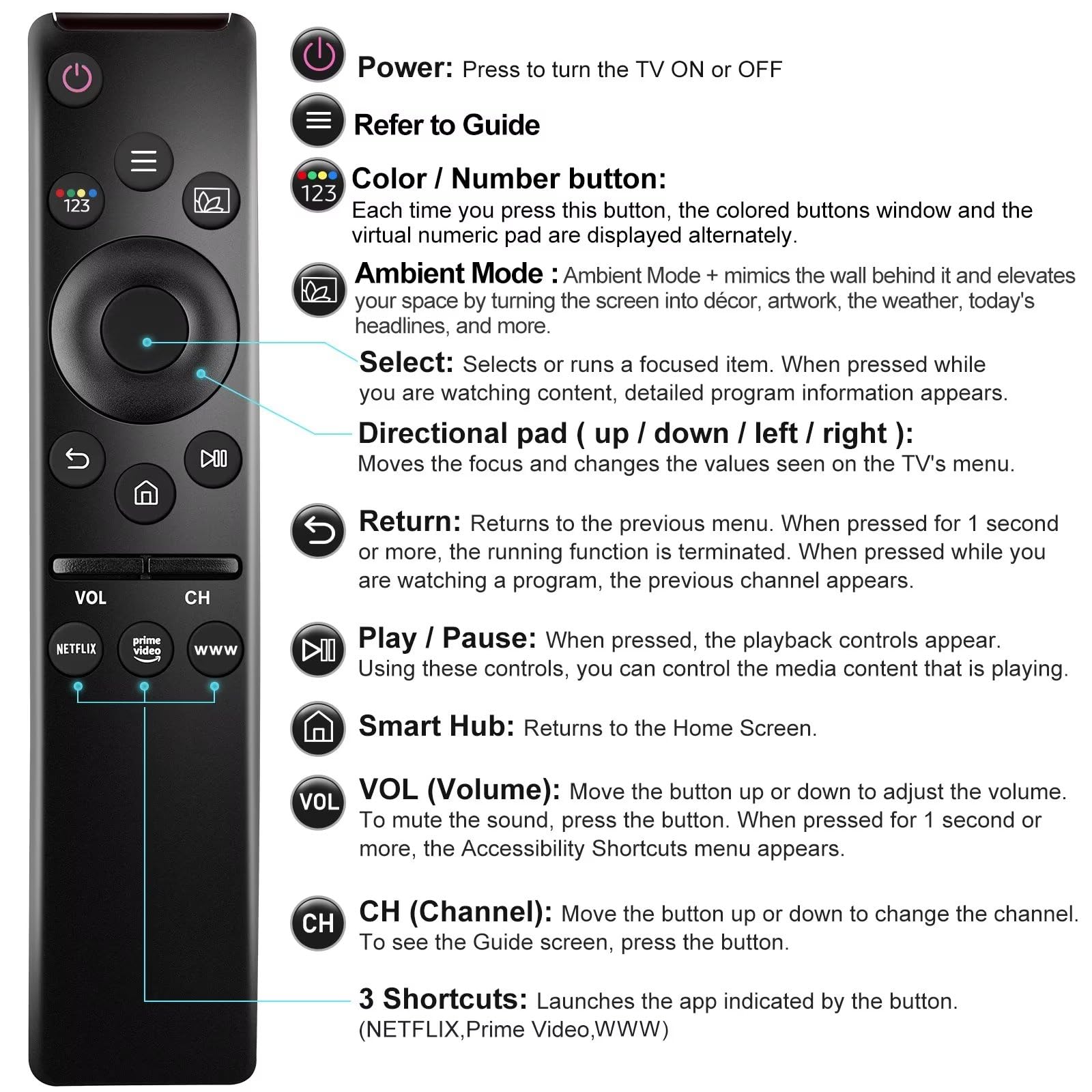 【REMOTE COMPATIBILITY】 Compatible with Samsung TV Remote All Models: BN59-01266A, BN59-01312A, BN59-01312G, BN59-01310A, BN59-01259E, BN59-01330A, BN59-01329A, BN59-01298A, BN59-01298H, BN59-01292A, BN59-01241A, BN59-01293A, BN59-01357A, BN59-01199F, BN59-01301A, BN59-01289A etc.
