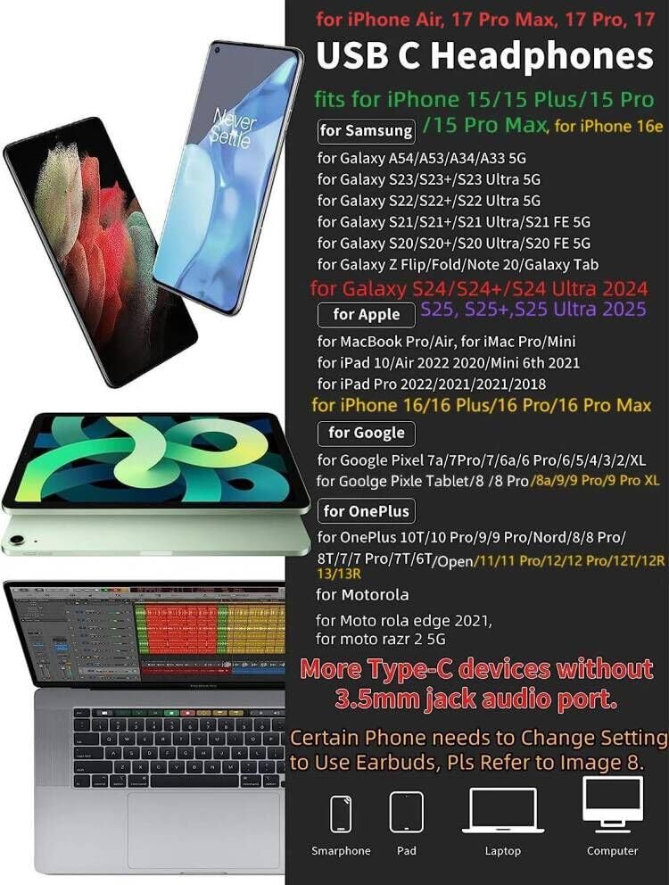 USB C Headphones with Microphone for iPhone 17 Pro Max,17 Pro,17,Air,16e,16,16 Pro,16 Plus,16 Pro Max,15,15 Plus,15 Pro,15 Pro Max,for Samsung S25 FE,S25Edge,S25,S25+,S25 Ultra,S24,S24+,S24 Ultra,for Google Pixel 10 Pro XL,9a,9,8a,8,7a,7,6a,Z Flip,Fold,S23 FE,S23,S23+,S23 Ultra,A17,A16,A26,A36,A56,A55,A53,A54,A33,A34,S22,S21 FE,S21,S20 FE,S20,Galaxy Tab,for OnePlus 13R 12R,10T,10 Pro,for Macbook Pro,for iPad 11 10,for iPad Pro,Mini 6 7,Air 4 5 6,for Motorola,for Nothing Phone,USB-C audio device