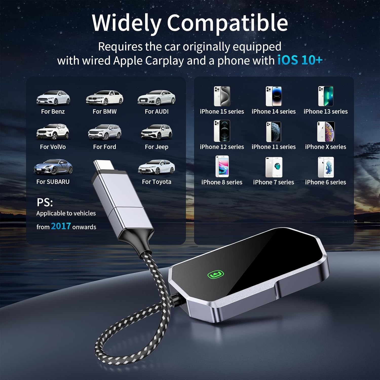 - Broad Compatibility, Seamless Integration: Compatible with a wide range of iPhone models, including iPhone 10 and above, our adapter ensures seamless integration with your smartphone. Additionally, it supports over 800 car models, encompassing major automotive brands and popular vehicles. No more compatibility worries, just pure wireless driving pleasure.