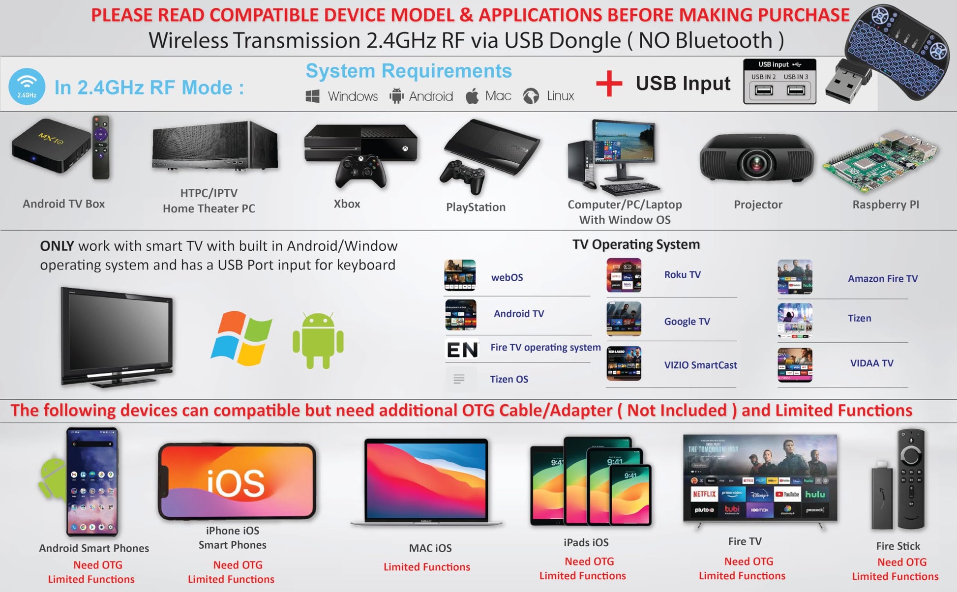 SEE COMPATIBLE LIST IN DESCRIPTION. NOT BLUETOOTH CONNECTION BUT 2.4GHZ WIRELESS USB DONGLE ADAPTER CONNECTION. Compatible with Android TV box, Smart TV with built in operating system , computer/laptop/desktop/pc with window OS, xBox, Sony ps3, HTPC Home Theater PC, projector, rasberry PI . SEE COMPATIBLE LIST IN DESCRIPTION BEFORE PURCHASE